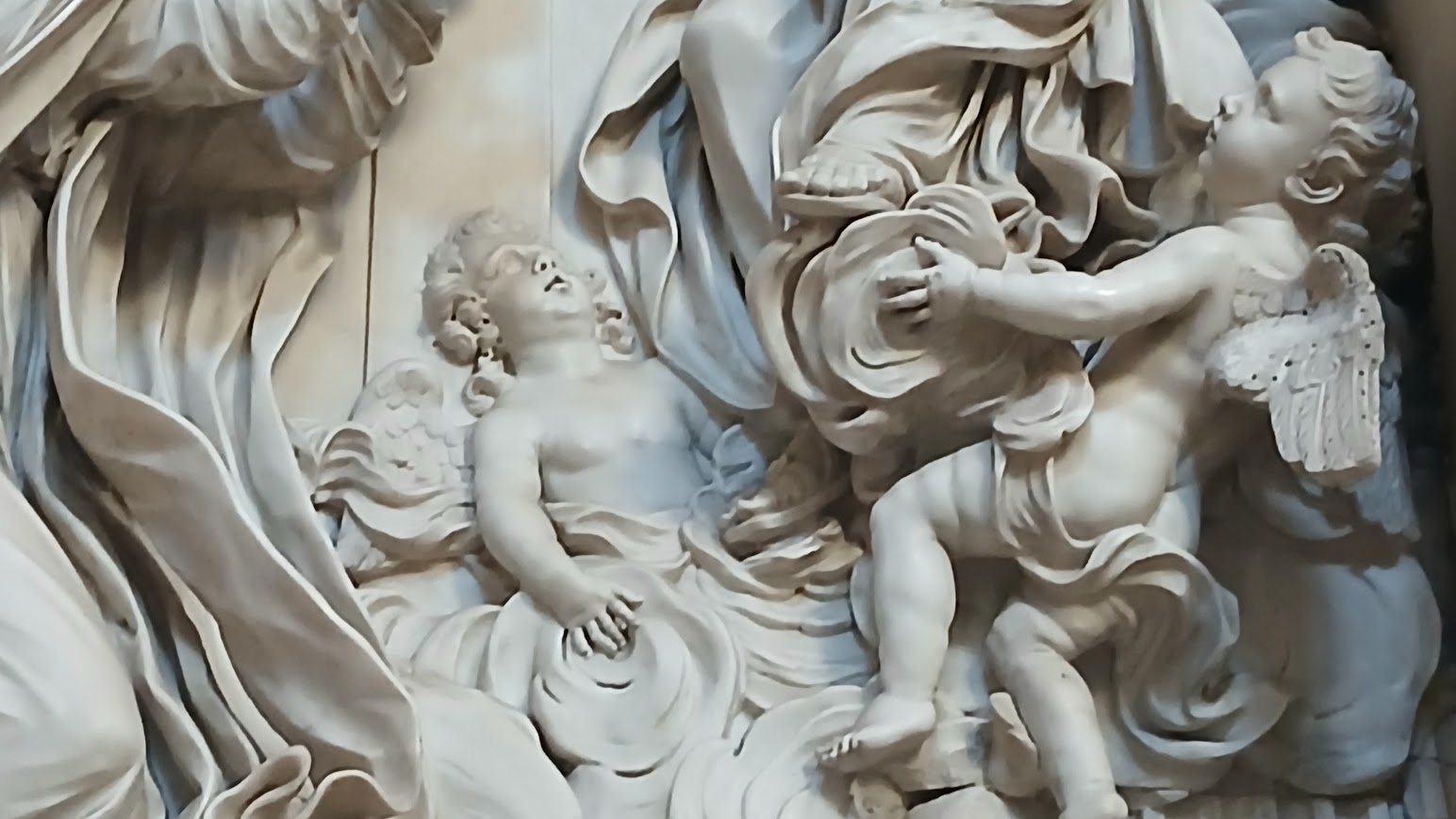 Uno degli aspetti più affascinanti del rilievo è l’uso del marmo, trattato con una sensibilità che rivela l’alta competenza tecnica dei Lazzoni. Le superfici alternano zone levigate a passaggi più vibranti, capaci di catturare la luce e amplificare il senso di movimento.