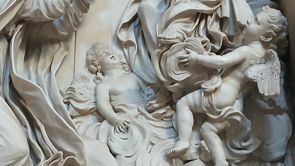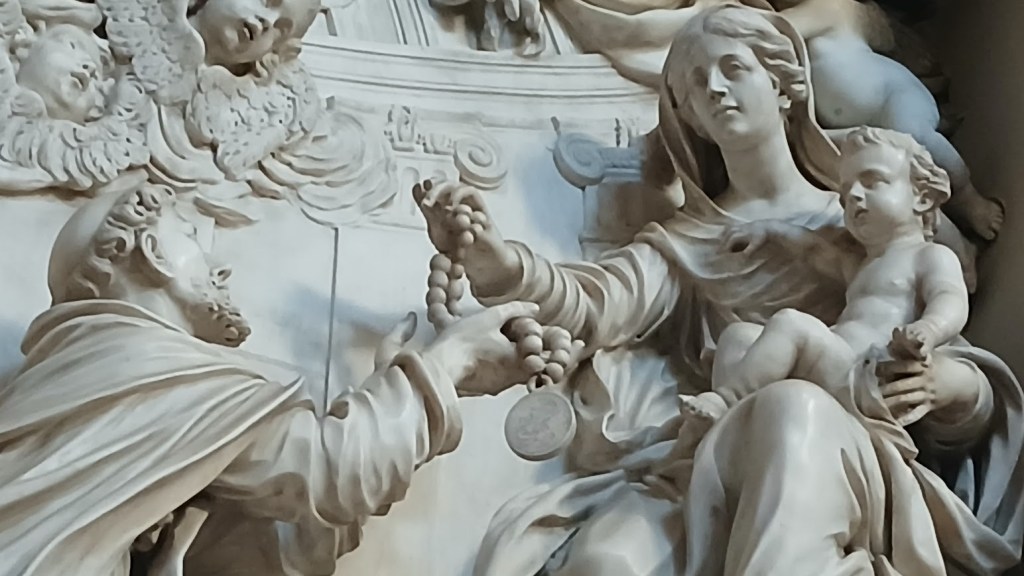 A questo contesto appartiene il rilievo marmoreo della Vergine che consegna a San Domenico la corona del Rosario, realizzato nel 1697 dagli scultori carraresi Andrea e Tommaso Lazzoni, una delle testimonianze più significative della diffusione del culto del rosario attraverso l’arte.