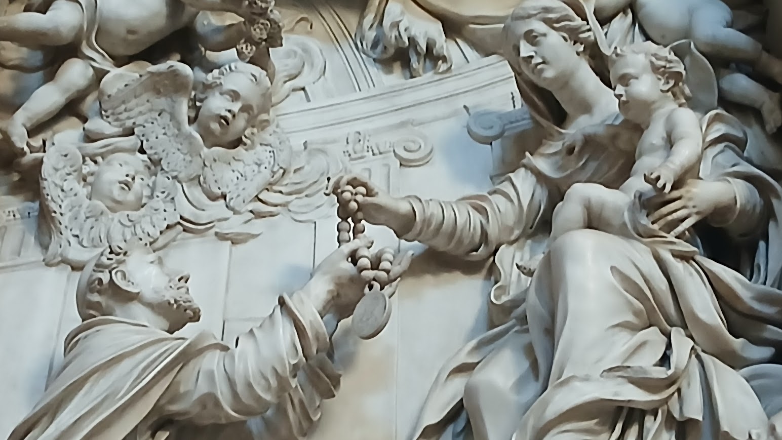 Probably placed in a Dominican ecclesiastical context or on an altar dedicated to Our Lady of the Rosary, the relief served as a focal point for community prayer, strengthening the connection between image, word, and ritual.