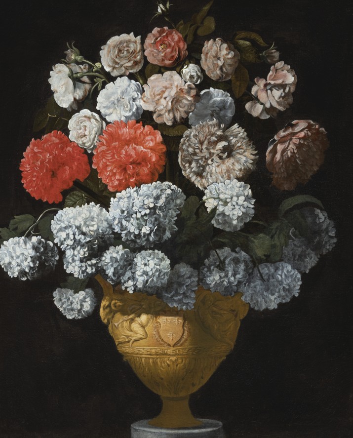 Natura morta con ortensie e rose in fiore in un vaso d’anfora