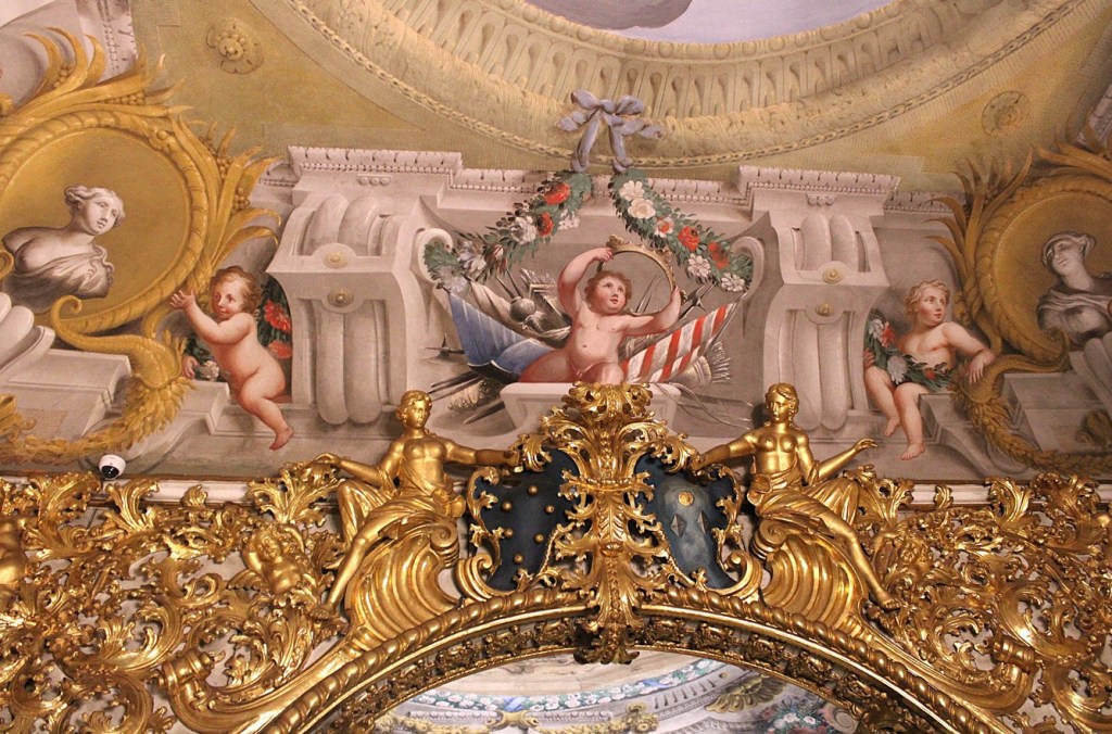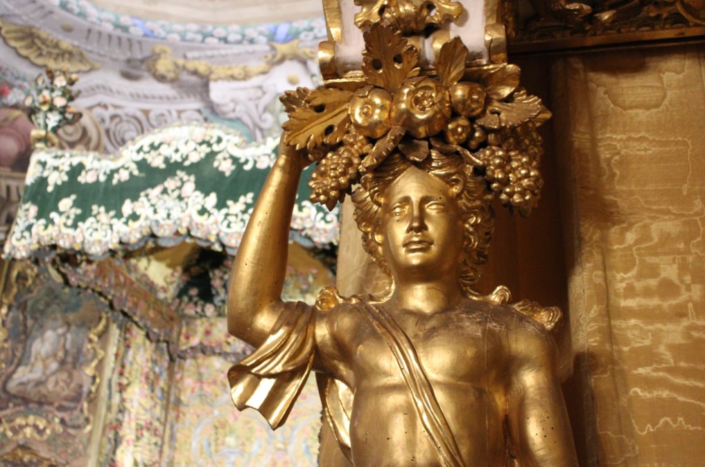 Collocata a chiusura delle stanze da parata, la stanza dell’Alcova rappresenta uno degli esiti più alti della produzione artistica e decorativa del periodo. Qui, lo sguardo degli ospiti veniva guidato verso uno spazio di forte impatto simbolico e visivo, pensato per celebrare prestigio, ricchezza e gusto.