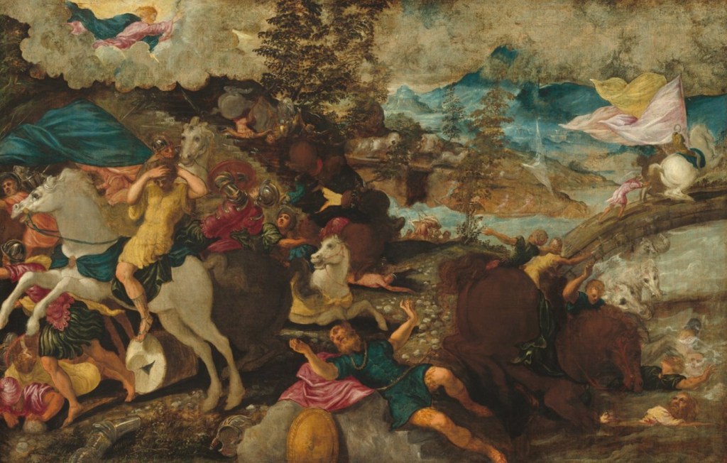 Tintoretto interpreta la Conversione di San Paolo come un fulmine improvviso. Le prospettive sono ardite, i corpi precipitano nello spazio e la luce irrompe con violenza teatrale. Il tempo sembra spezzarsi in un istante irreversibile.
