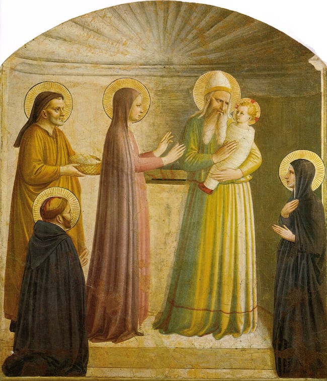 Nel Rinascimento la scena si carica di equilibrio e armonia. Fra Angelico, nel convento di San Marco a Firenze, dipinge una Presentazione intima e contemplativa, dove la luce è morbida, spirituale, quasi silenziosa.
