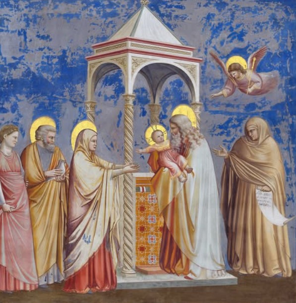 Con il Medioevo, la rappresentazione della Candelora si fa più narrativa. Giotto, nella Cappella degli Scrovegni, introduce emozione e profondità psicologica: il gesto di Simeone diventa affettuoso, lo spazio architettonico del Tempio è riconoscibile e la luce accompagna lo sguardo dello spettatore verso il Bambino.