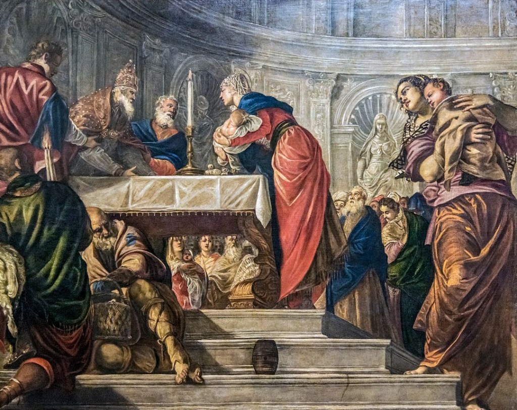 Nel Cinquecento, artisti come Lorenzo Lotto e Tintoretto amplificano il dinamismo della scena. Le architetture diventano complesse, i gesti più teatrali, la luce più drammatica. La Presentazione al Tempio non è più solo un rito, ma un evento che coinvolge lo spazio e lo spettatore.