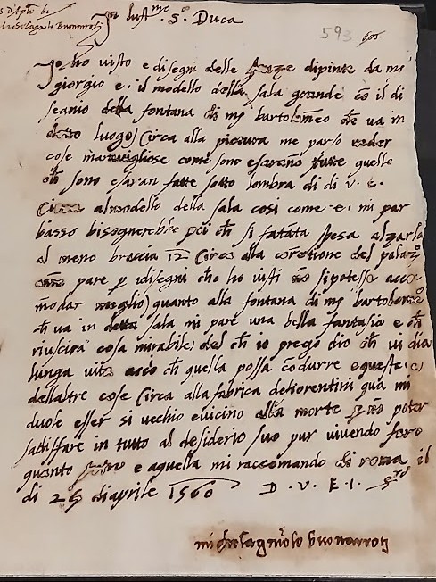 Mi erano stati fatti vedere i disegni delle stanze ideati dal mio caro amico Giorgio Vasari e il modello della Sala grande, con il progetto della fontana ideata da Bartolomeo Ammannati.