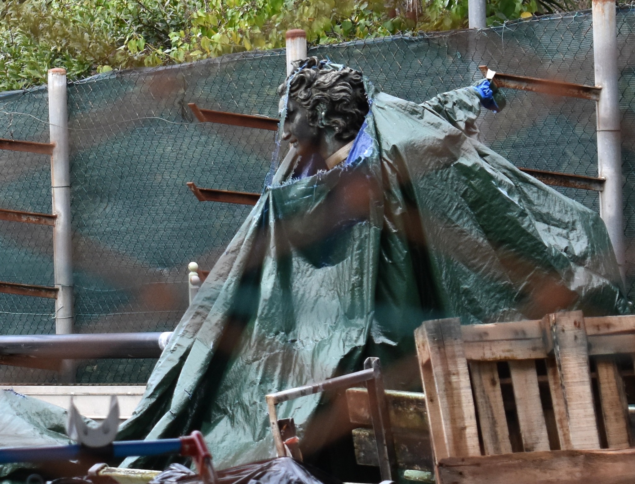 In 2020, to make room for the nascent Mitoraj Museum, the sculpture was removed and moved to a warehouse near the cemetery on Via Garibaldi. Despite the city administration’s promises to restore her and relocate her to the museum’s new square, the peasant woman remains invisible today, covered by a green tarp, with only her head protruding.