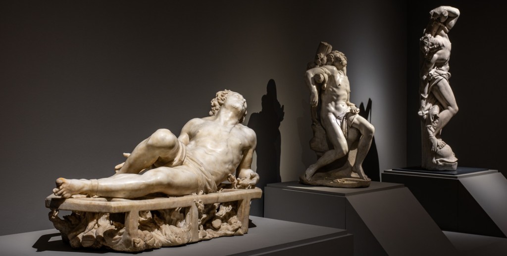 La prima sezione ricostruisce l’incontro tra il giovane scultore e Maffeo Barberini, con opere realizzate in collaborazione con il padre e capolavori giovanili che anticipano già il linguaggio barocco. Tra queste spiccano il San Lorenzo degli Uffizi e il San Sebastiano, esposto eccezionalmente in dialogo con il San Sebastiano Barberini.
