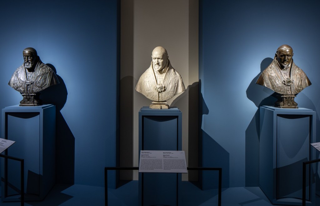 Ampio spazio è riservato anche alla ritrattistica papale, con una straordinaria serie di busti di Urbano VIII provenienti da musei e collezioni internazionali. Queste opere mostrano l’evoluzione di una formula destinata a diventare canonica, in cui il volto del pontefice si trasforma in immagine assoluta del potere spirituale e temporale.