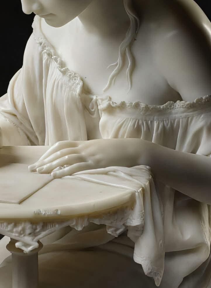 Spertini’s name became a fixture at national exhibitions thanks to a sculpture that became a symbol of his sensibility: the “Girl Writing,” created in 1866. The work depicts a young woman seated, captured in a moment of concentration, writing a letter.