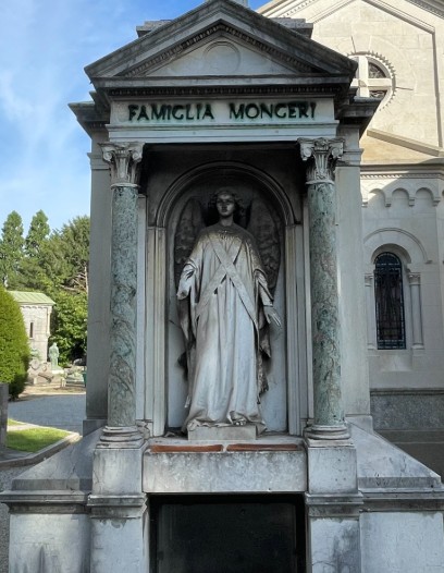 His presence is also visible at Milan’s Monumental Cemetery, where he sculpted funerary figures of great expressive intensity, including the angel of the Mongeri Aedicule. These works demonstrate the sculptor’s ability to combine romantic sentiment and anatomical precision, qualities that made his art particularly appreciated in 19th-century funerary sculpture.