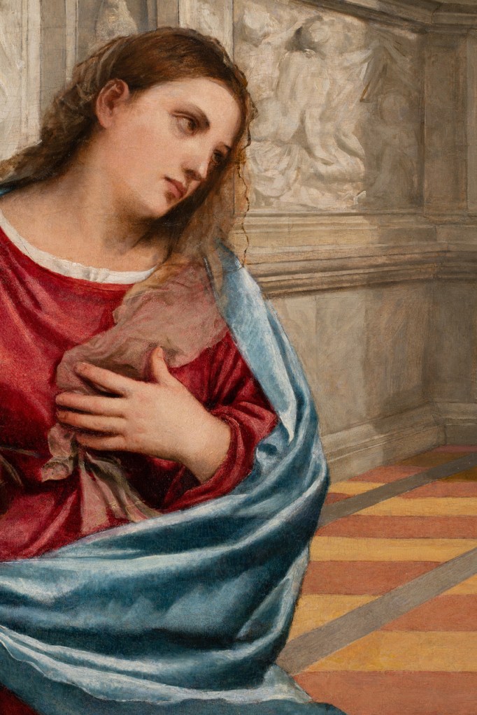 Protagonista assoluta è l’Annunciazione Malchiostro, proveniente dal Duomo di Treviso e datata 1520, lo stesso anno della Pala Gozzi. Questo dato cronologico, emerso anche grazie ai recenti restauri, consente un confronto stringente tra due opere coeve che segnano una svolta nell’iconografia tizianesca.