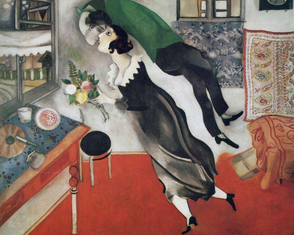 Conservato al Museum of Modern Art, il quadro trasmette un senso di leggerezza e felicità. L’amore diventa una forza capace di sfidare la gravità e trasformare la realtà in sogno.