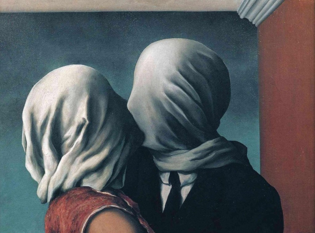 Il pittore surrealista René Magritte ha raccontato l’amore in modo completamente diverso. Nel dipinto “Gli Amanti”, due figure si baciano con il volto coperto da un velo bianco.
