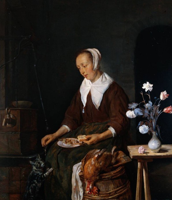 L’opera, realizzata intorno al 1661, rappresenta una donna seduta a tavola mentre due gatti cercano di approfittare del cibo. La scena è intima, silenziosa, costruita con una luce morbida e dettagli minuziosi. Il gatto qui non è simbolo astratto, ma presenza concreta della vita di casa, quasi un piccolo disturbatore affamato che rende la scena ancora più realistica.