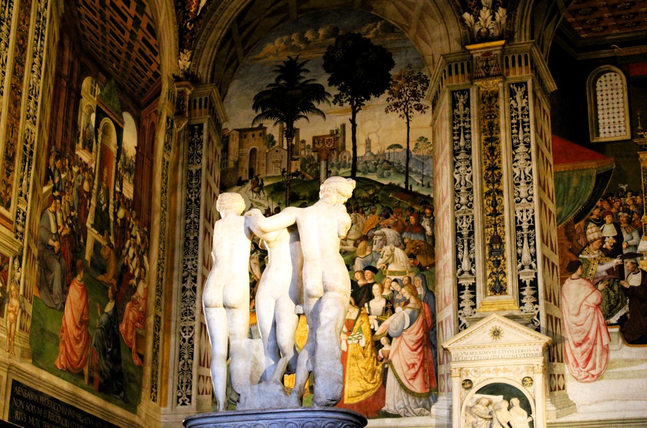 Durante l’esperienza è possibile ammirare la splendida Libreria Piccolomini, celebre per i suoi affreschi rinascimentali e per l’intensità dei colori che, alla luce dell’alba, assumono sfumature ancora più suggestive. Il percorso prosegue poi verso la Porta del Cielo, il camminamento panoramico nei sottotetti del Duomo che permette di osservare la Cattedrale da un punto di vista privilegiato, sospesi tra arte e architettura.