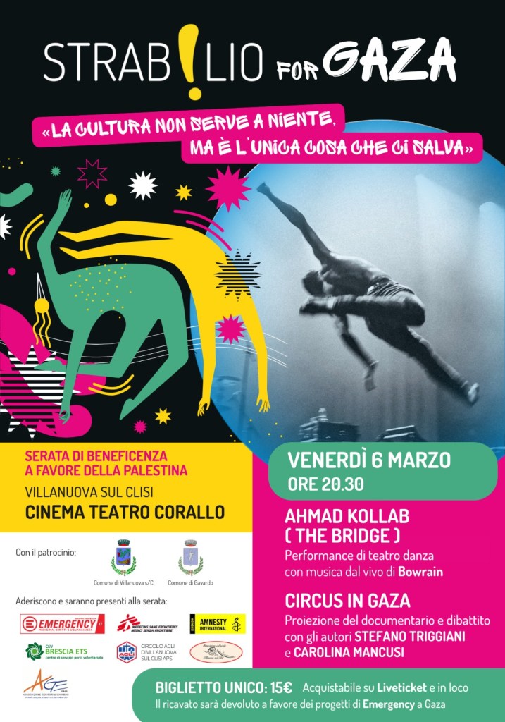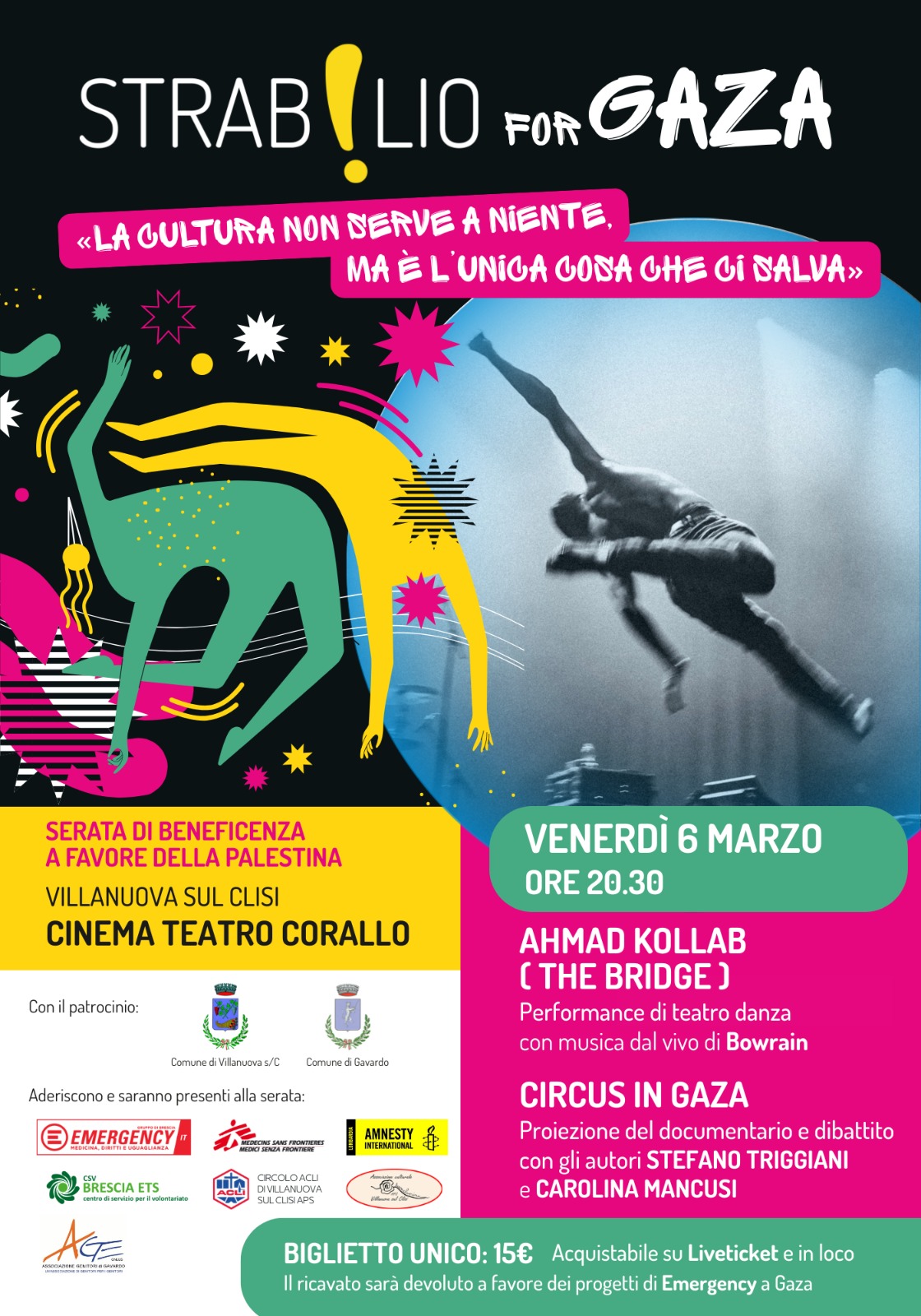 Una serata di arte e solidarietà arriva a Villanuova sul Clisi. Venerdì 6 marzo alle ore 20.30 il Teatro Corallo ospiterà “Strabilio for Gaza”, un evento speciale che unisce cinema, danza e circo contemporaneo per raccontare la realtà della Striscia di Gaza e raccogliere fondi a sostegno delle organizzazioni umanitarie impegnate sul campo.