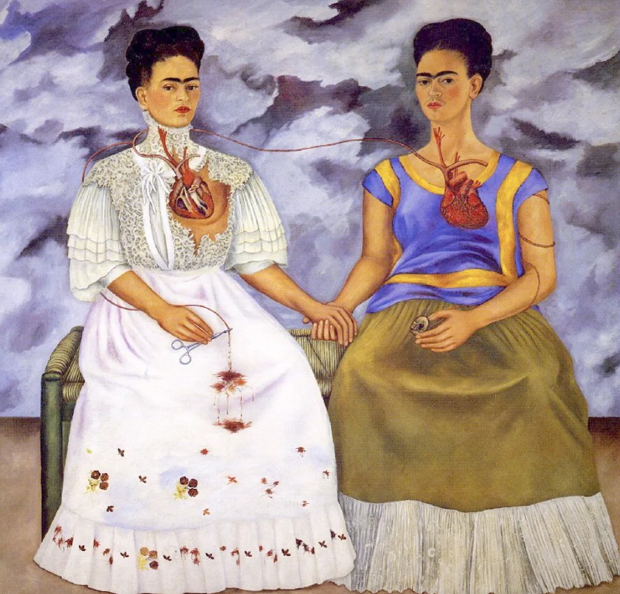 Among her most famous works is The Two Fridas, a double self-portrait showing two versions of the artist sitting side by side, their hearts exposed and connected by a vein.