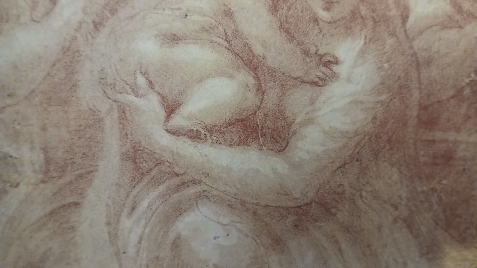 The sheet, executed in red chalk with white highlights and outlines traced with a metal point, measures just 131 x 175 millimeters. Despite its small size, this drawing has a complex history of engravings, collectors, and controversial attributions.