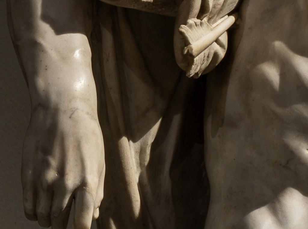 The saint’s body, young and athletic, recalls classical beauty, while the pose supported by a trunk reminiscent of the cross draws a parallel with the Christ in my Vatican Pietà.