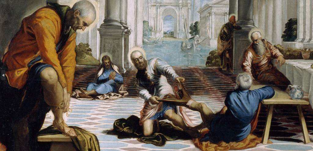 The painting depicts Jesus washing the feet of the apostles, a gesture of humility and love preceding the Last Supper.