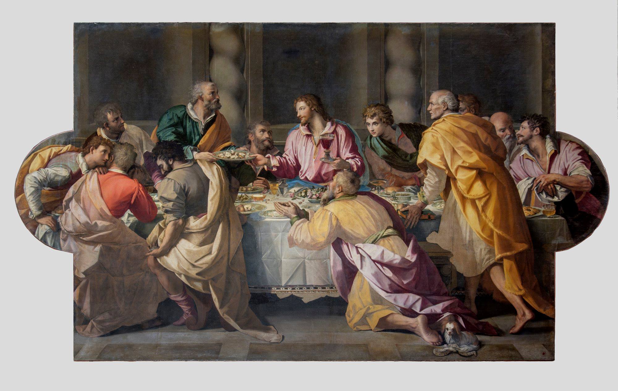 Alessandro Allori’s Last Supper is part of the long tradition of Florentine convent cenacles, spaces intended for monks’ meditation during meals. Allori clearly draws on Andrea del Sarto’s model, reinterpreting it in a Mannerist style, with a greater emphasis on scenography and color.