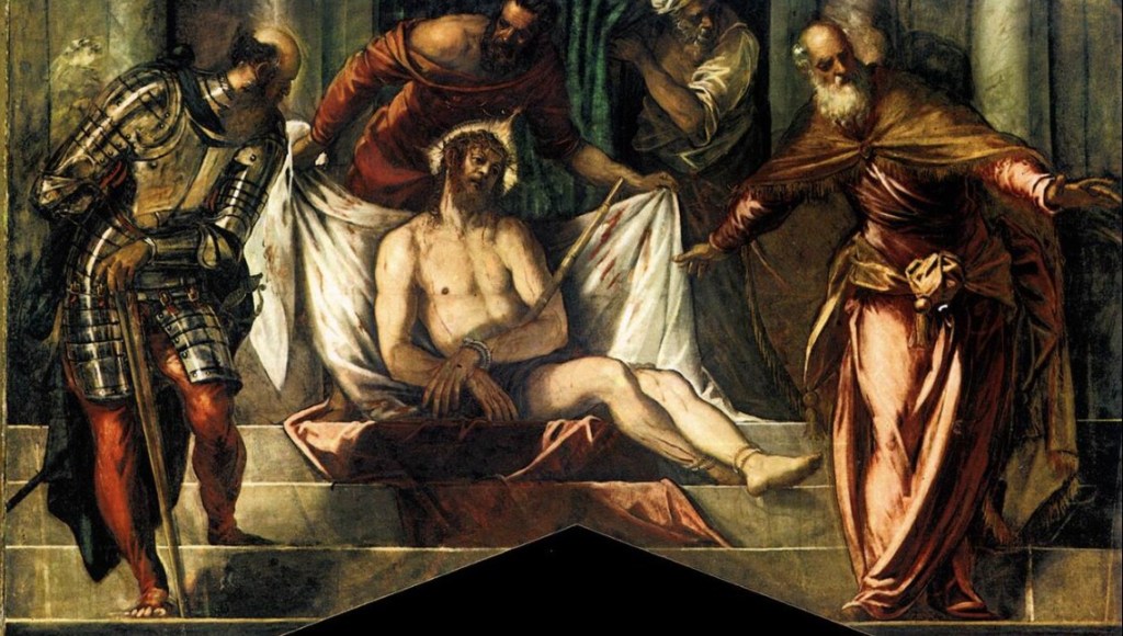 Nell’interpretazione di Tintoretto, l’Ecce Homo diventa una scena carica di energia e movimento. La luce taglia lo spazio, le figure si dispongono in una composizione dinamica e coinvolgente, e lo spettatore si trova immerso in un racconto visivo che sembra svolgersi sotto i suoi occhi.