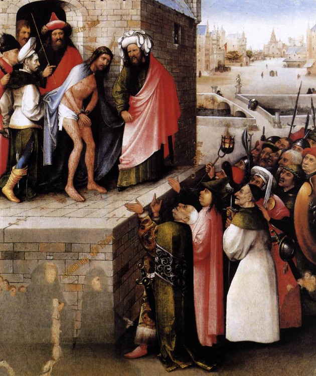 Nelle opere di Hieronymus Bosch la scena si amplia e si trasforma in una rappresentazione quasi visionaria. Cristo è circondato da figure caricaturali, volti grotteschi e inquietanti che incarnano la crudeltà e l’irrazionalità della massa. Qui l’Ecce Homo diventa una denuncia della violenza collettiva, una riflessione sulla perdita di umanità di fronte al potere della folla.