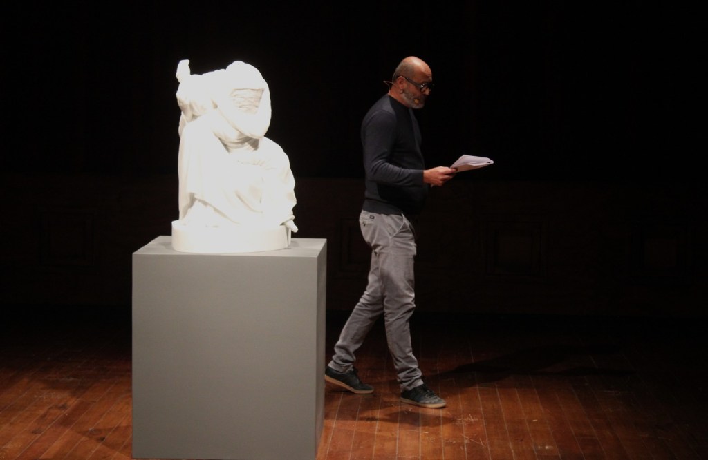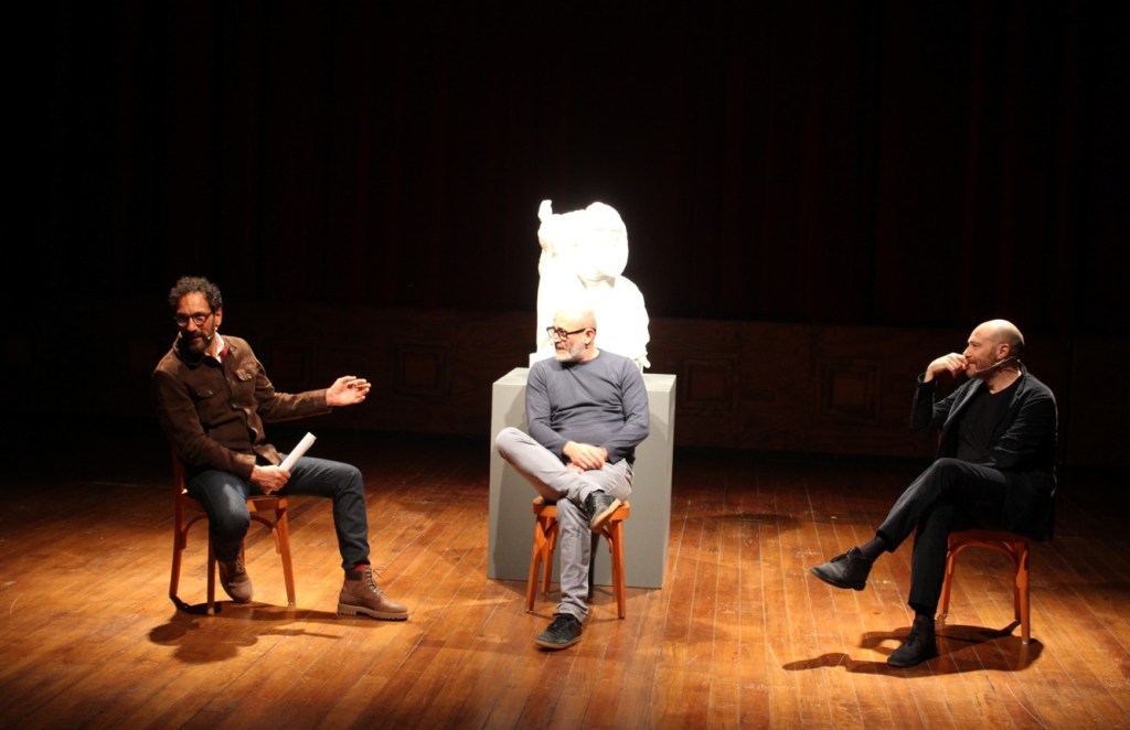 The protagonists: the sculptor Filippo Tincolini, along with Federico Quaranta and Andrea Pezzi. Three different languages—material, words, stage presence—for a single question: are we still capable of feeling pity?