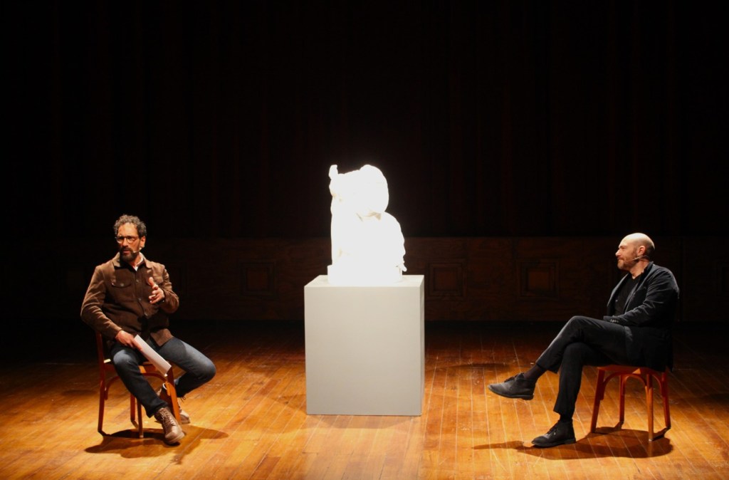 Tincolini introduces the two-person dialogue as he slowly circles his sculpture, compelling the audience not to look away: