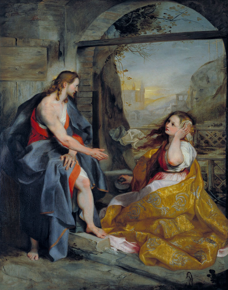 Barocci sceglie di rappresentare proprio quell’istante sospeso, in cui il gesto della donna si arresta e lo spazio tra i due diventa il vero protagonista della scena. È una distanza sottile ma decisiva, che segna il passaggio tra il mondo terreno e quello spirituale.