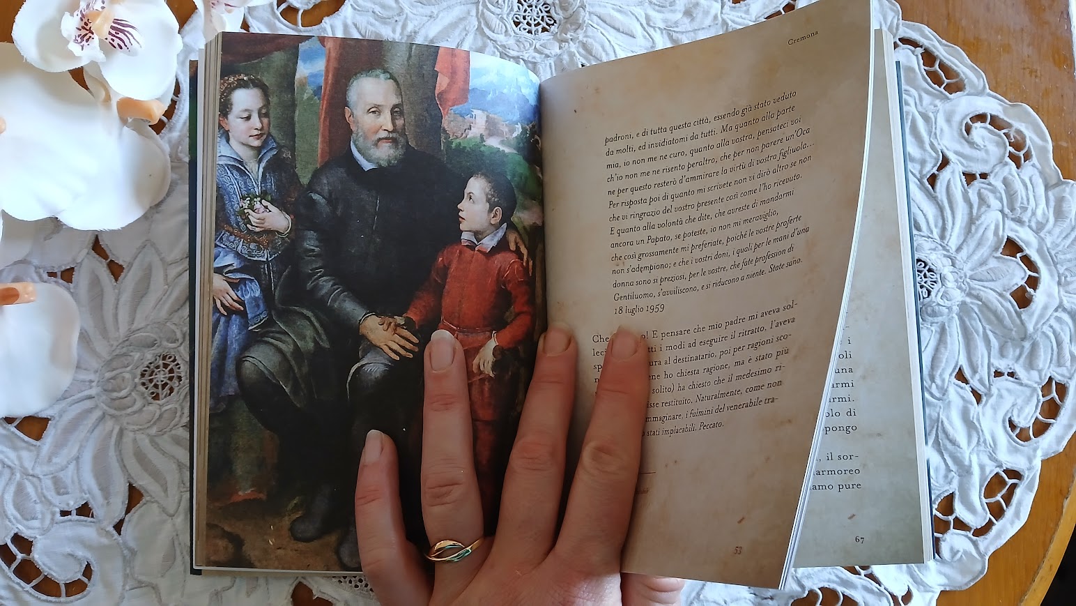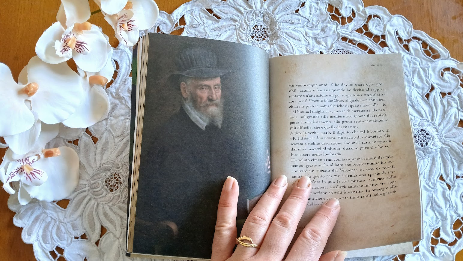 Uno degli aspetti più affascinanti del libro è la ricostruzione del viaggio come struttura portante della vita di Sofonisba. Dalla Cremona di provincia alla Milano dei governatori, poi Madrid, cuore politico e simbolico del mondo, dove diventa pittrice di corte e osserva da vicino anche il dramma di Don Carlos.