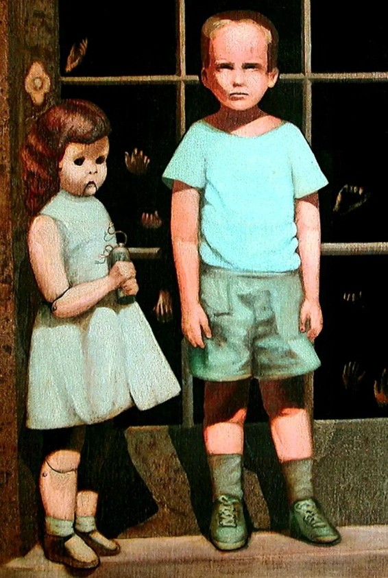 The painting depicts a child next to a doll, in front of a glass door behind which disturbing hands can be seen.