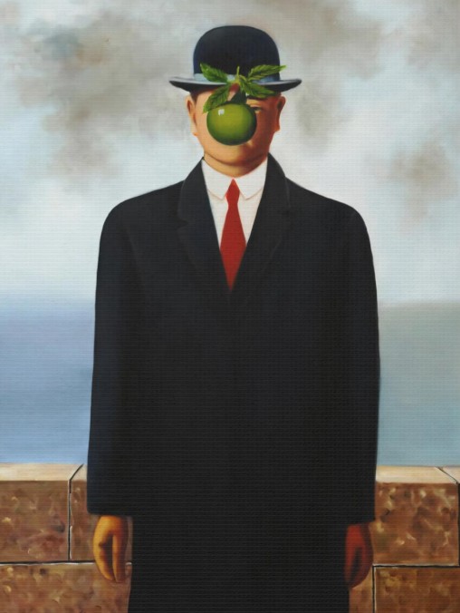 Quest’opera di René Magritte è apparentemente semplice: un uomo in giacca e cravatta con il volto coperto da una mela verde.