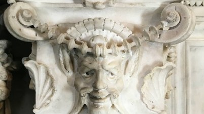 Nella Sagrestia Nuova, immediatamente dietro le quattro ore del giorno, si possono ammirare dettagliati fregi decorativi che hanno la foggia di mascheroni con la bocca aperta e gli incisivi a vista...