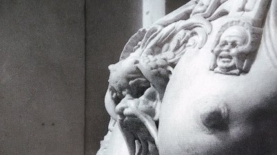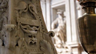 Nella Sagrestia Nuova, immediatamente dietro le quattro ore del giorno, si possono ammirare dettagliati fregi decorativi che hanno la foggia di mascheroni con la bocca aperta e gli incisivi a vista...
